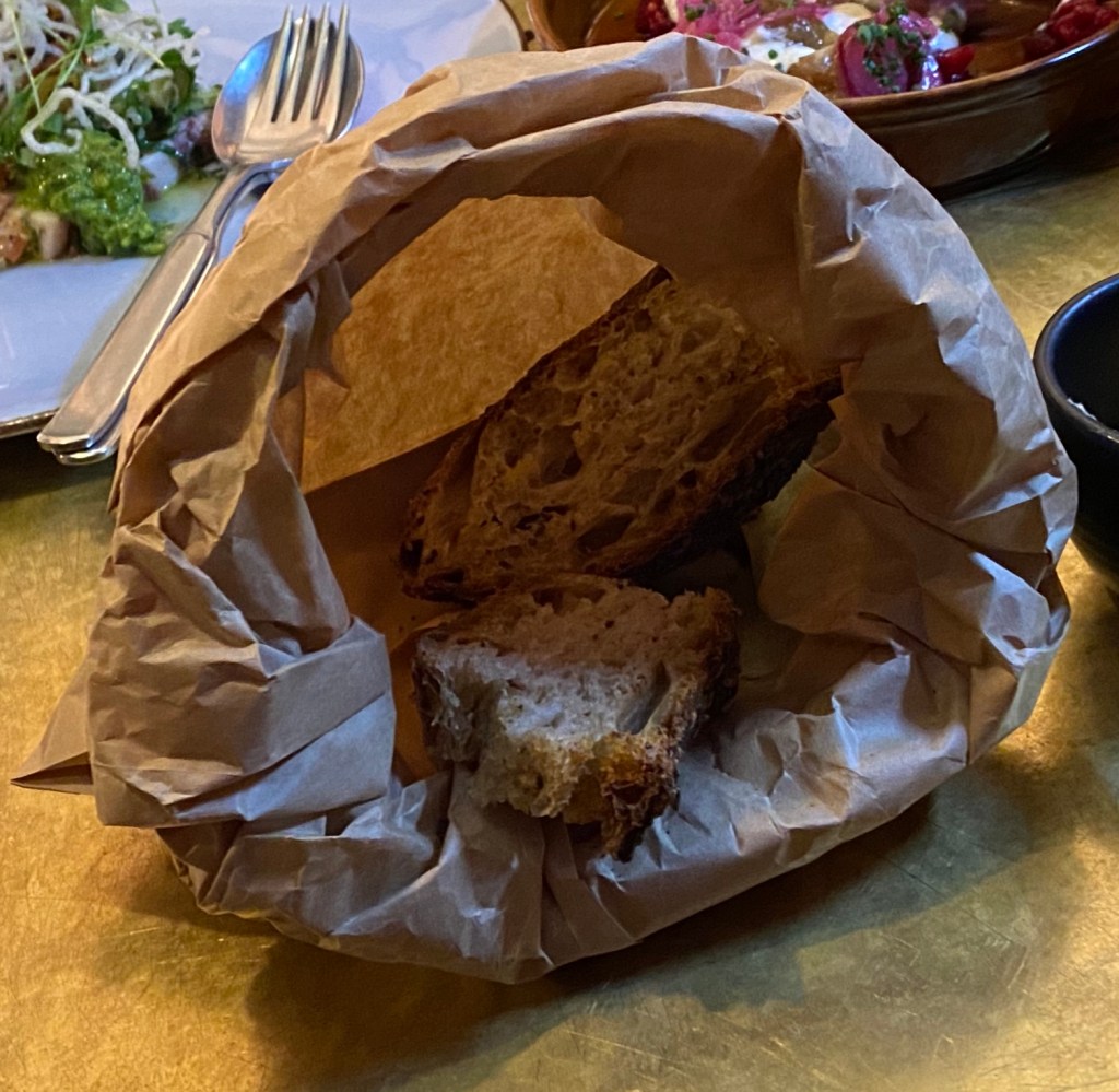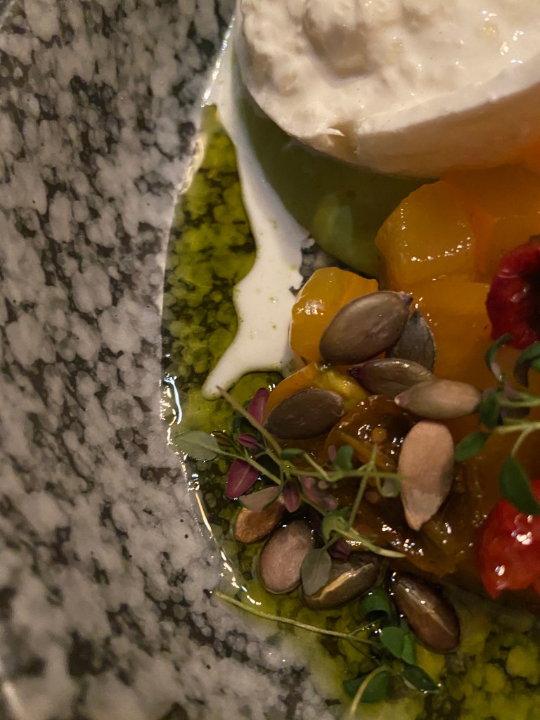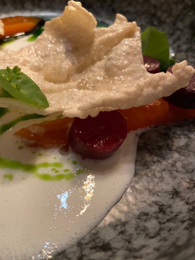 Maa-artisokka hurmasi heti. Kuoripäällinen ” mullasta nostettu juuresten timantti” oli paahdettu pehmeäksi sisältä. Haudutettua purjoa ja rapeita chipsejä, kermaista ja pehmeää, mutta ilmavaa piimäkastiketta. Lasiin pulppuilee kauniin väristä -Causse Marine Sy Rose- Rose viiniä syrah rypäleestä. N-A-M.