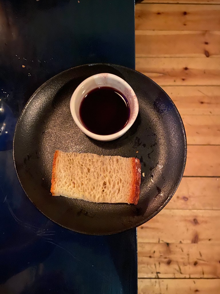 Tuoretta focacciaa ja mustaa oliiviöljyä, ihanan pehmeää ja suolaista! Leivän fenkolinsiemenet ja musta oliiviöljy korostivat toisiaan.