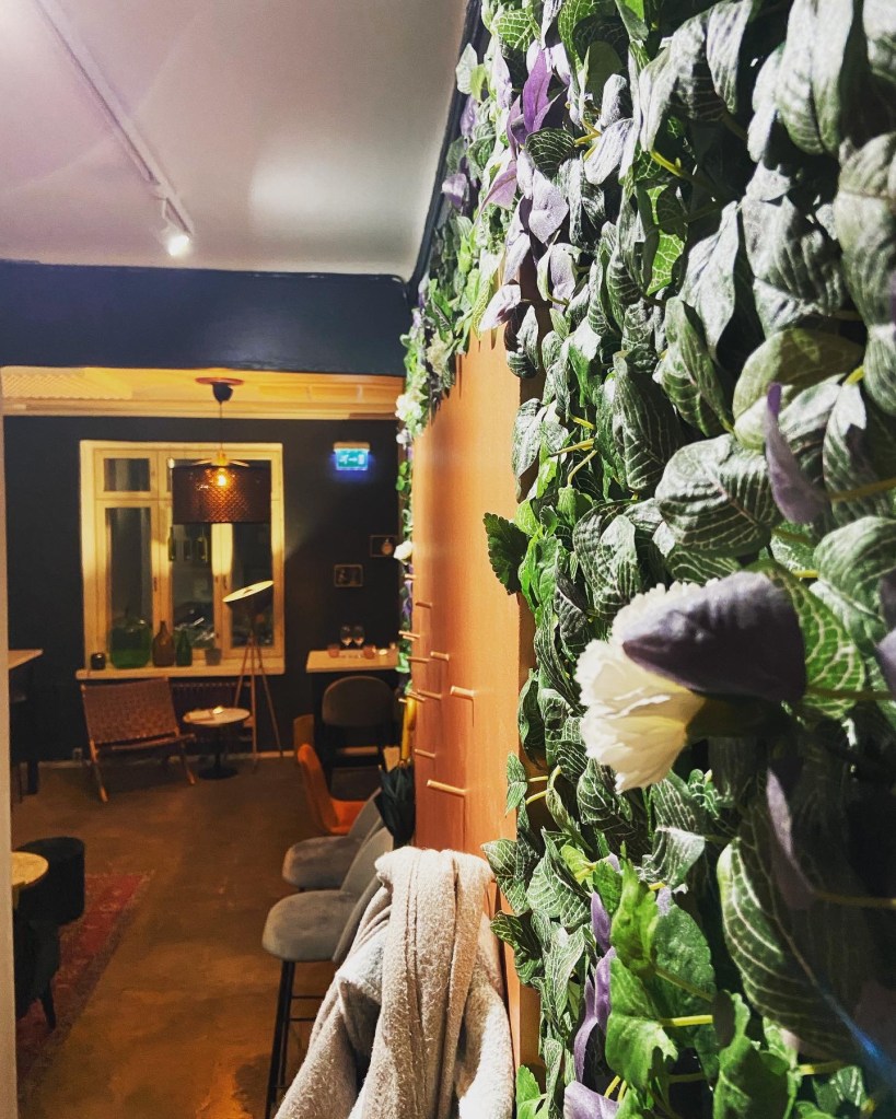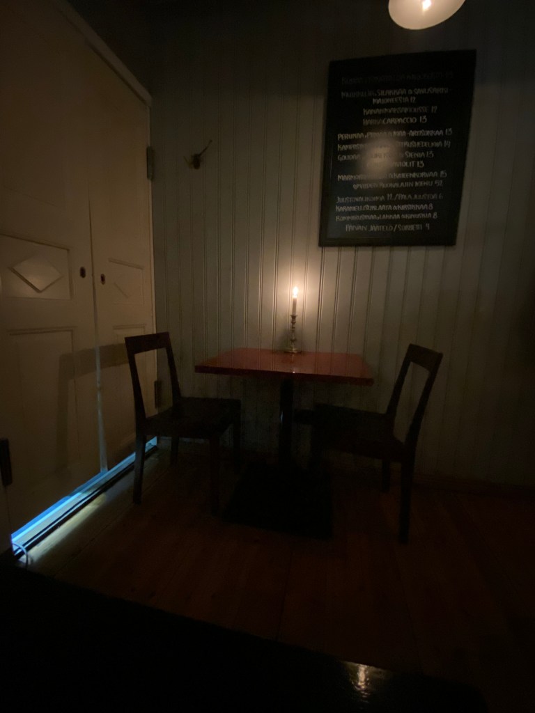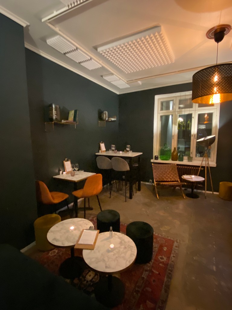 Pääsimme istumaan ”peräkammariin” Tila on täynnä viinipulloja, kynttilöitä, kauniita murrettuja värisävyjä ympärillämme.