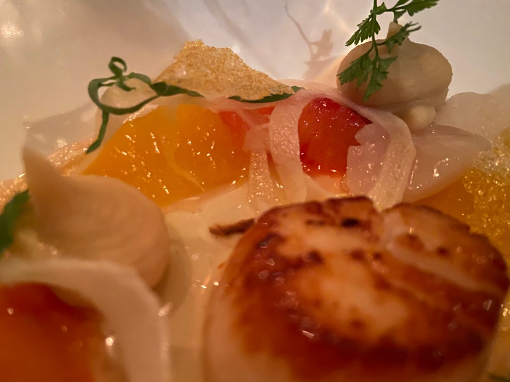 Toisena ruokana saamme kampasimpukoita, appelsiinisalaatti ja fenkolia. Keväinen kombo on klassinen, tuttu ja turvallinen… minkälainen viini tulee seuraksi?